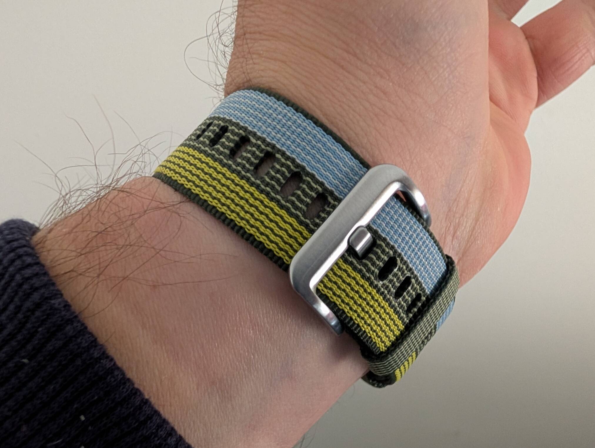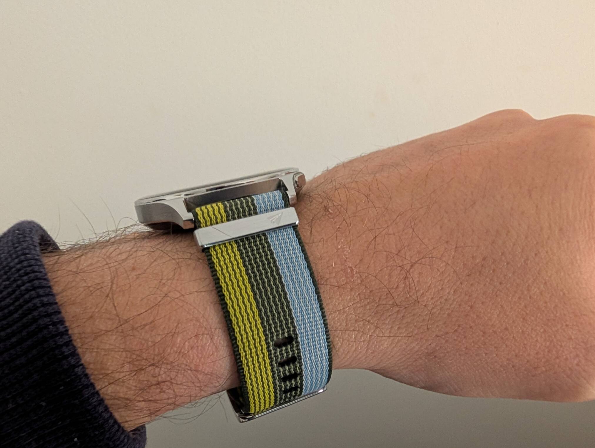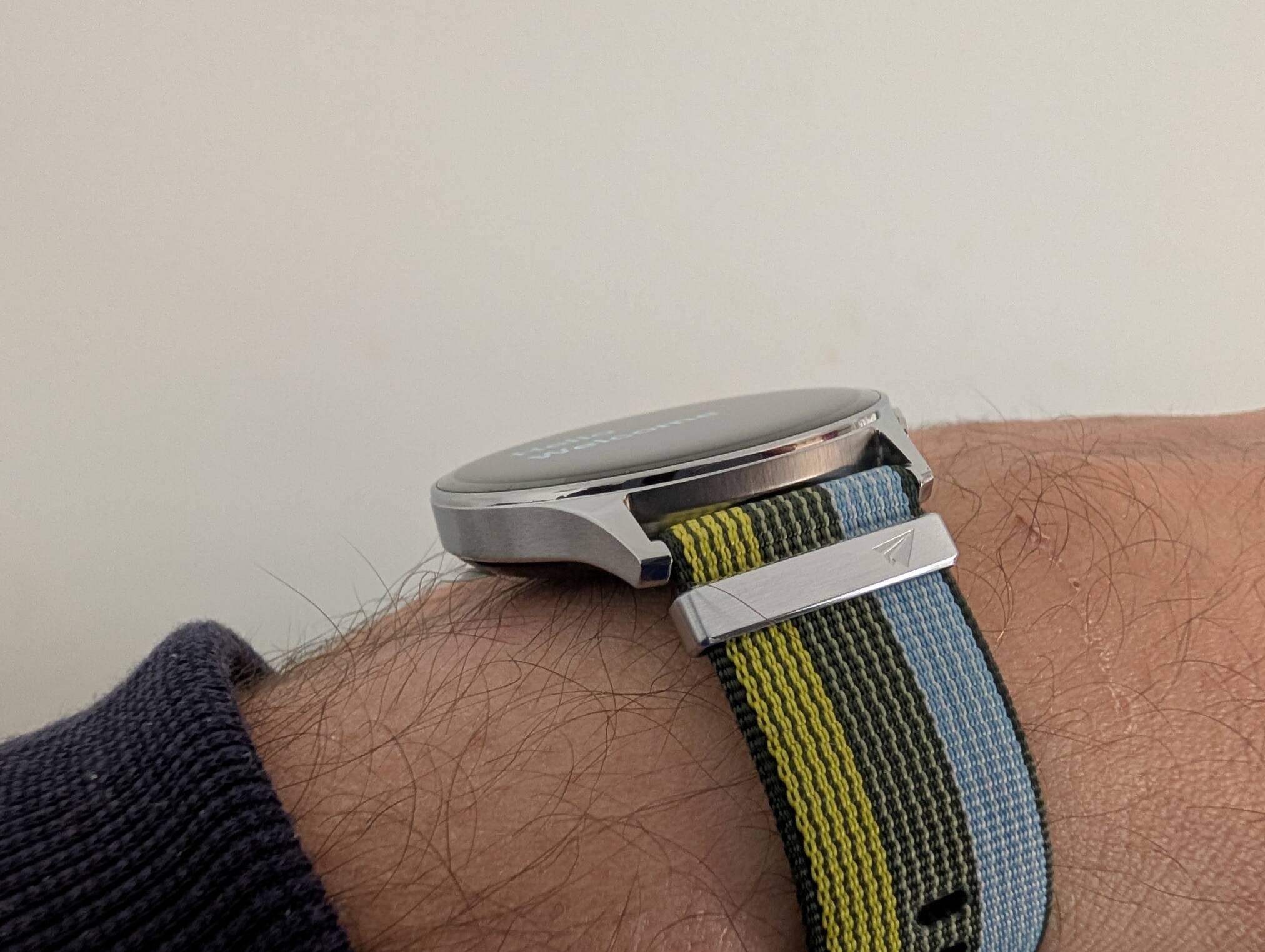 No pulso, sente-se discreto. Em camisas com punho mais apertado não fica preso nem “empurra” o tecido. A sensação é mais próxima de um relógio tradicional leve do que de um mini computador amarrado ao braço.